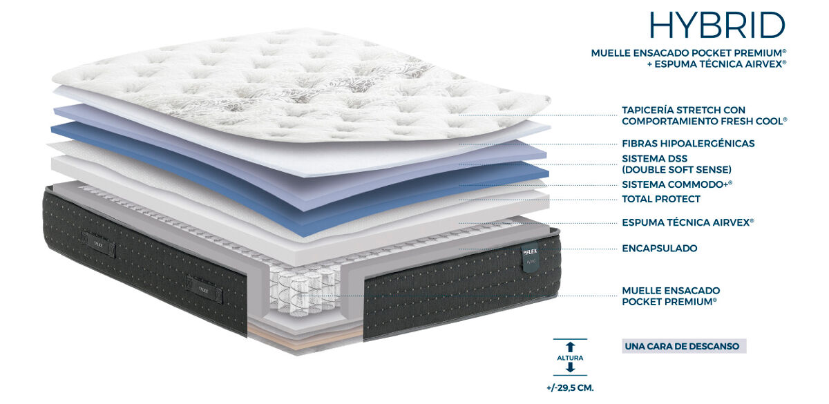 El colchón HYBRID 135x182 es la combinación perfecta de tecnología y confort. Con su exclusivo sistema de muelle ensacado Pocket Premium, disfrutarás de un soporte ergonómico y una distribución óptima del peso corporal. Además, su encapsulado proporciona una mayor estabilidad y durabilidad. La espuma técnica AirVex ofrece una excelente adaptabilidad y transpirabilidad, garantizando un descanso fresco y saludable. Con el sistema Total Protect, tu colchón estará protegido contra ácaros, bacterias y hongos, cuidando de tu salud y bienestar. El sistema Commodo+ y el sistema Double Soft Sense brindan una suavidad y acogida inigualables, proporcionando un descanso reparador. Las fibras hipoalergénicas y la tapicería Stretch con comportamiento Fresh Cool completan este colchón, ofreciendo confort y frescura durante toda la noche. Su diseño One side facilita el mantenimiento y la limpieza. Con una altura de 29,5 cm, el colchón HYBRID 80x190 te brinda el descanso que mereces, combinando tecnología de vanguardia y materiales de alta calidad. ¡Duerme como nunca antes!