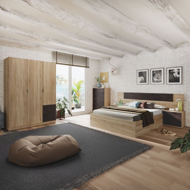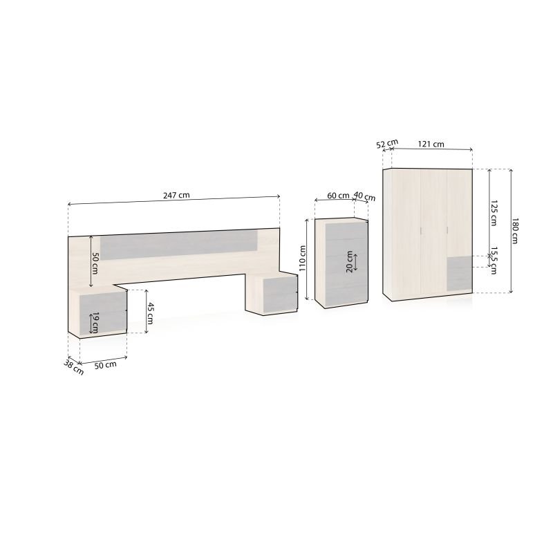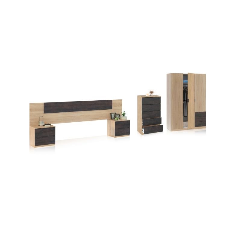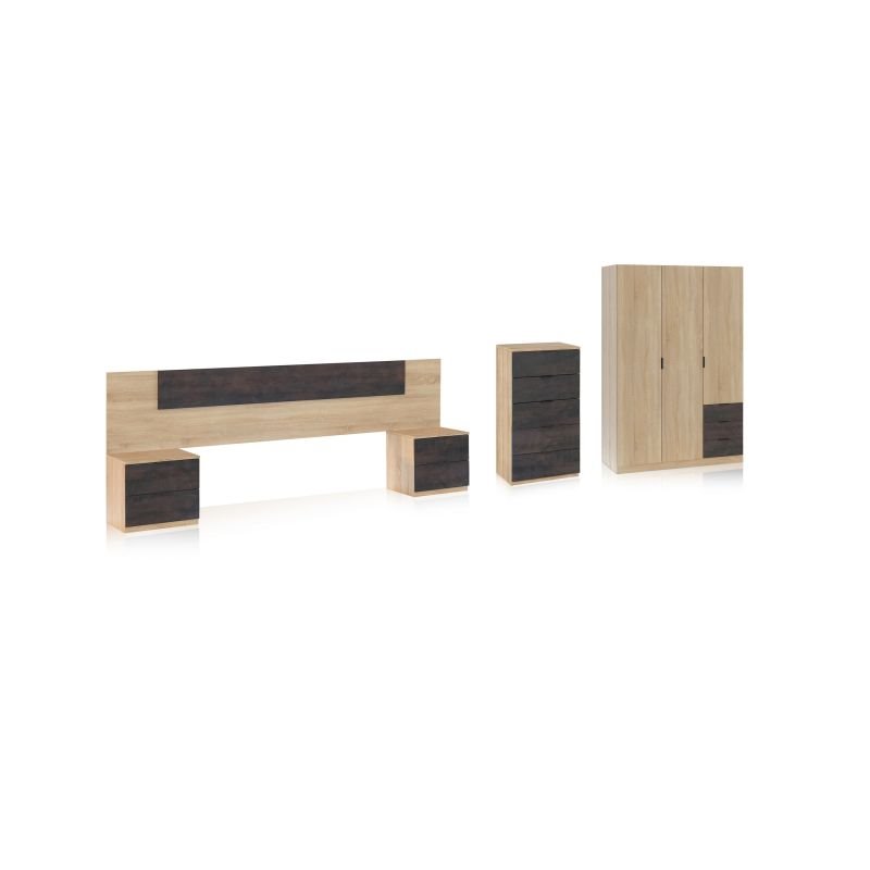 - Pack compuesto por un cabecero, dos mesitas de noche, una cómoda y un armario