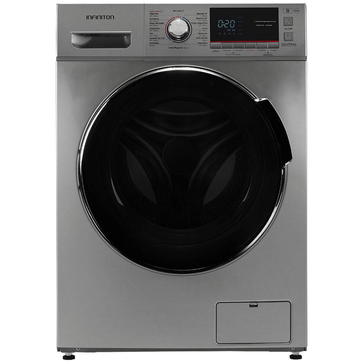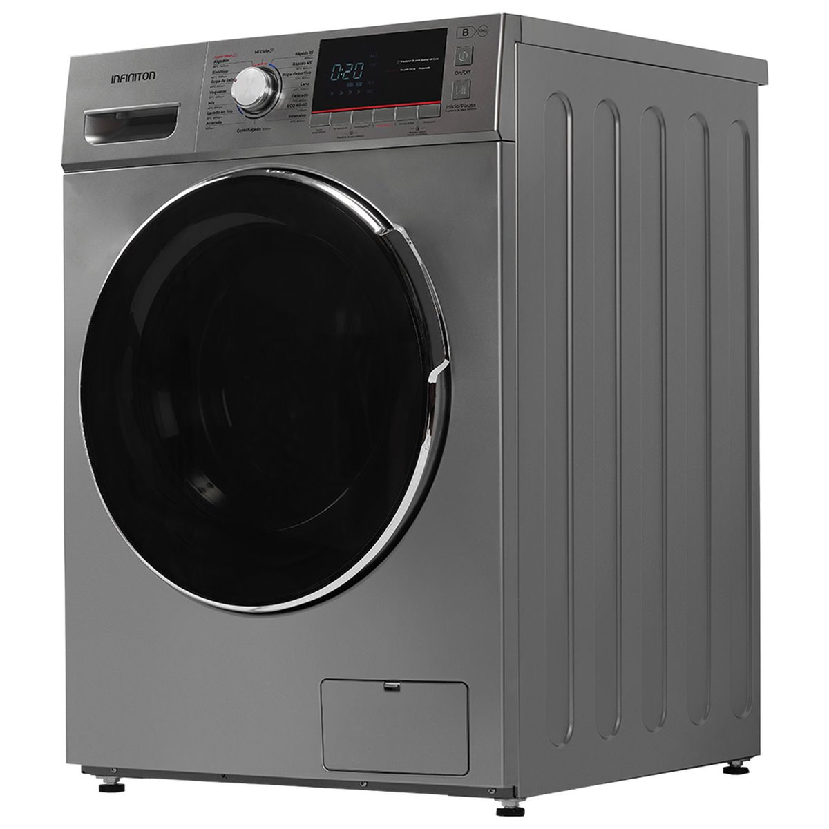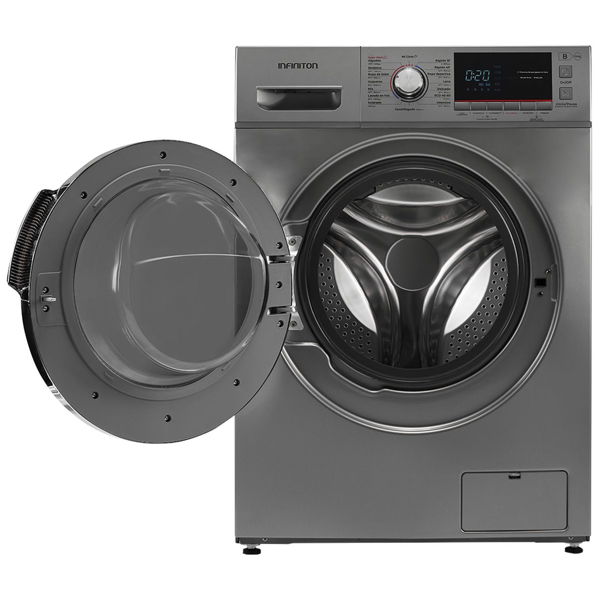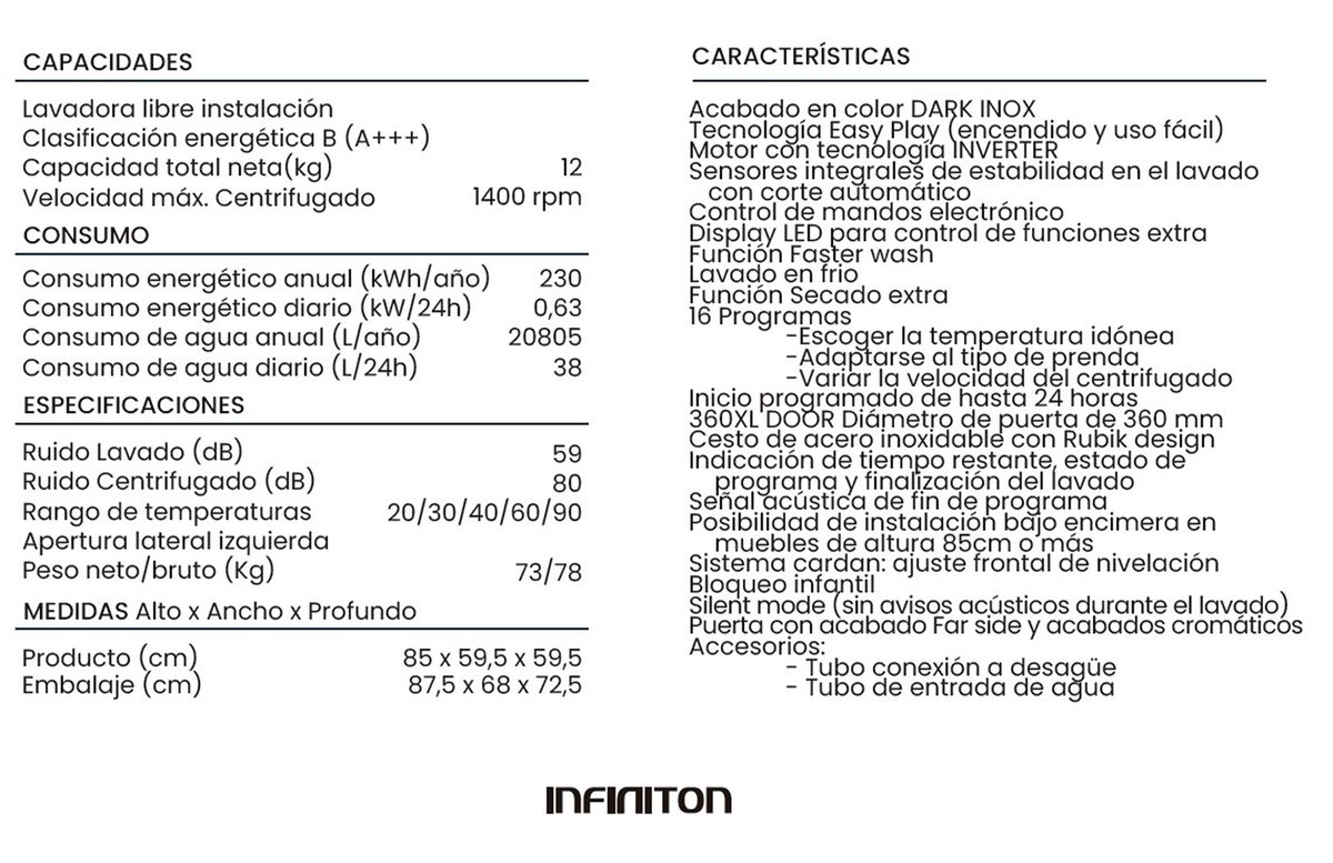 Acabado en color DARK INOX. Tecnología Easy Play (encendido y uso fácil). Motor con tecnología INVERTER. Sensores integrales de estabilidad en el lavado con corte automático. Control de mandos electrónico. Display LED para control de funciones extra. Función Faster wash. Lavado en frio. Función Secado extra. 16 programas: escoger la temperatura idónea, adaptarse al tipo de prenda, variar la velocidad del centrifugado. Inicio programado de hasta 24 horas. 360XL DOOR Diámetro de puerta de 360 mm. Cesto de acero inoxidable con Rubik design. Indicación de tiempo restante, estado de. programa y finalización del lavado. Señal acústica de fin de programa. Posibilidad de instalación bajo encimera en muebles de altura 85cm o más. Sistema cardan: ajuste frontal de nivelación. Bloqueo infantil. Silent mode (sin avisos acústicos durante el lavado). Puerta con acabado Far side y acabados cromáticos. Accesorios: tubo conexión a desagüe, tubo de entrada de agua.